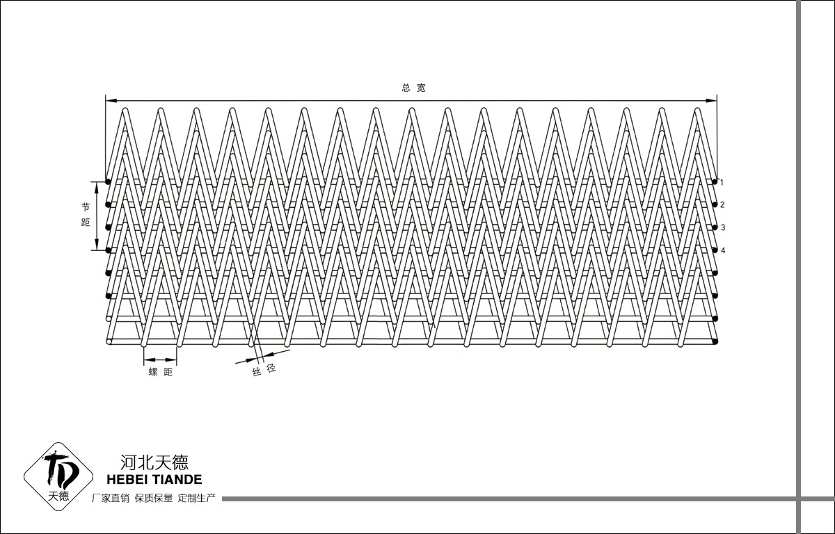 人字形網(wǎng)帶由左右交替的網(wǎng)條通過四根直串條聯(lián)結(jié)而成,準(zhǔn)確的編織技術(shù)使網(wǎng)帶既具有密度、高網(wǎng)孔、細(xì)運(yùn)行靈活的特點(diǎn),它對材料和編織技術(shù)要求高。