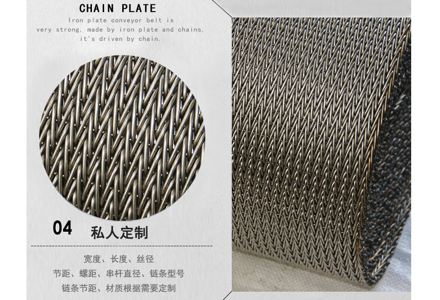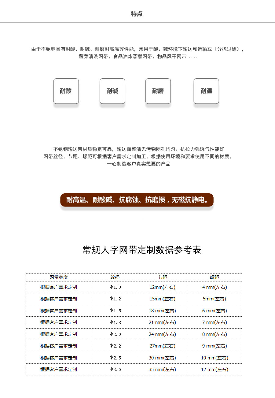 人字形網(wǎng)帶應(yīng)用:主要應(yīng)用于食品烘干機(jī)、蔬菜、海產(chǎn)品清洗機(jī),巴氏機(jī),方便面米粉蒸煮、熱收縮膜包裝機(jī)。玻璃瓶罐、食品、燈炮、金屬、器皿、化纖、印染、醫(yī)藥、電子、粉末冶金、熱處理、木材、物流輸送等各行業(yè)自動(dòng)裝置和自動(dòng)流水線的使用;焦?fàn)t煤氣及電子紅外線等各種窯爐系統(tǒng)的傳動(dòng)使用等食品機(jī)械,玻璃機(jī)械,輸送機(jī)械。