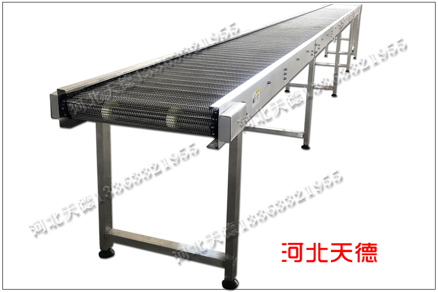 鏈條輸送帶采用31.75毫米的節(jié)距,輸送帶孔采用鋼絲直徑1.2毫米編織大小為10*15毫米。