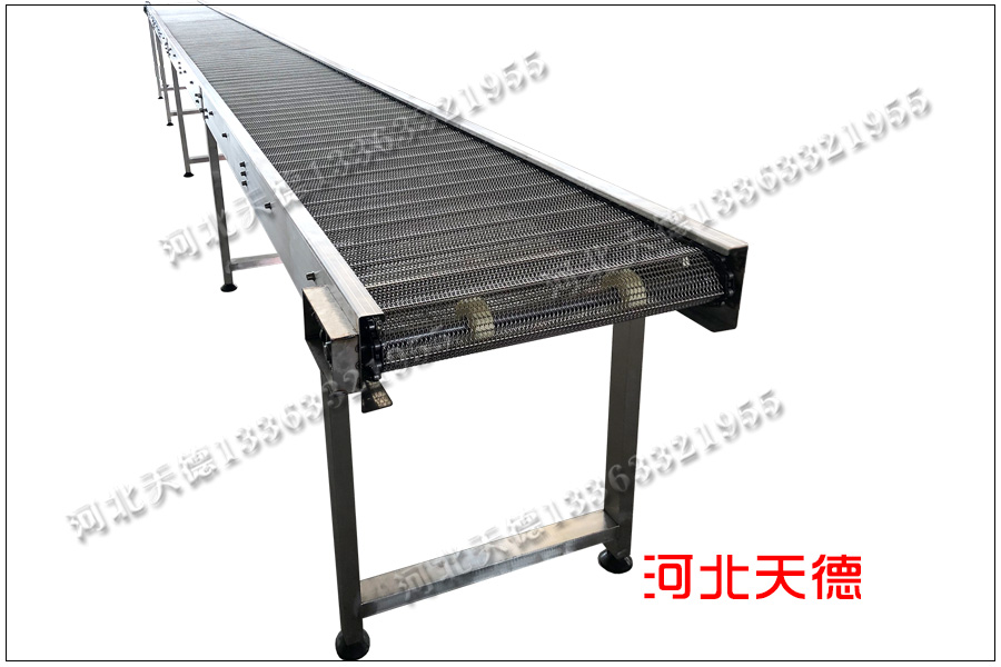 這臺(tái)輸送機(jī)的總長(zhǎng)度為8米,總寬度為60公分,高度為70公分,不銹鋼304材質(zhì)。采用鏈條輸送帶輸送,輸送帶寬度為55公分,長(zhǎng)度為16.5米,鏈條節(jié)距為38.1毫米,桿直徑為8毫米,間距為150毫米左右。絲徑為1.8毫米,孔徑為15*20毫米。采用耐高溫不銹鋼304材質(zhì)。