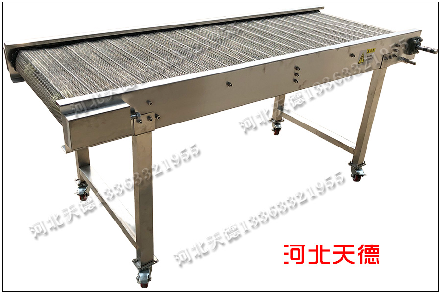 吉林省德惠市客戶定制的小型網(wǎng)帶輸送機(jī),該輸送就只是用來單純的輸送物品,輸送機(jī)長度為2米,高度為半米,寬度為400毫米,不銹鋼304材質(zhì)。